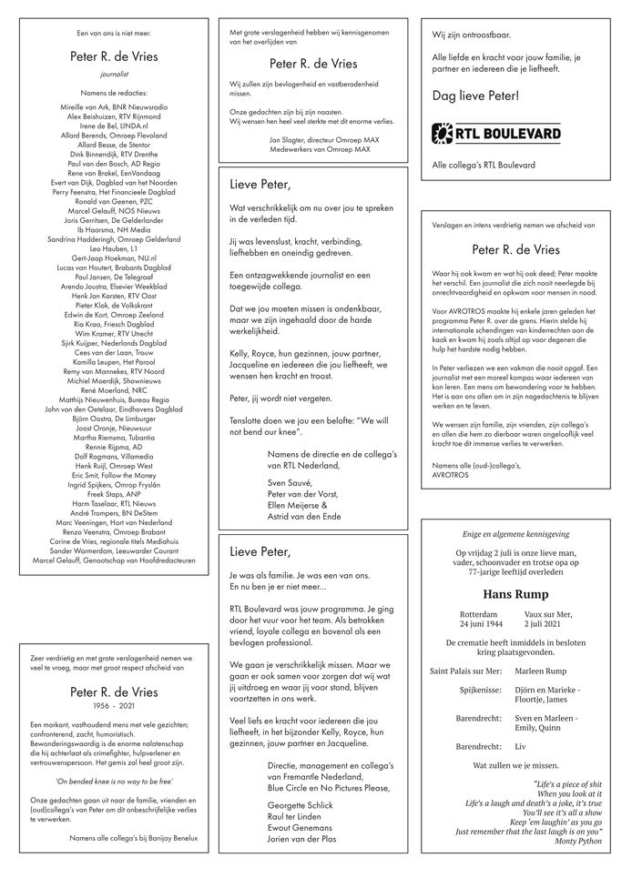 Rouwadvertentie Peter R. De Vries - Check spelling or type a new query.. Maybe you would like to learn more about one of these? We did not find results for: Check spelling or type a new query.